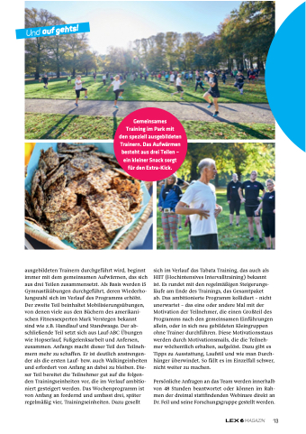 ausgebildeten Trainern durchgeführt wird beginnt immer mit dem gemeinsamen Aufwärmen das sich aus drei Teilen zusammensetzt Als Basis werden 15 Gymnastikübungen durchgeführt deren Wiederho- lungszahl sich im Verlauf des Programms erhöht Der zweite Teil beinhaltet Mobilisierungsübungen von denen viele aus den den Büchern des amerikani- schen Fitnessexperten Mark Verstegen bekannt sind wie z B Handlauf und Standwaage Der ab- schließende Teil setzt sich aus Lauf-ABC Übungen wie Hopserlauf Fußgelenksarbeit und Anfersen zusammen Anfangs macht dieser Teil Teil den Teilneh- mern mehr zu schaffen Er ist deutlich anstrengen- der als die ersten Lauf- bzw auch Walkingeinheiten und erfordert von Anfang an an dabei zu bleiben Die- ser Teil Teil bereitet die die Teilnehmer gut auf die die folgen- den Trainingseinheiten vor die im Verlauf ambitio- niert gesteigert werden Das Wochenprogramm ist von Anfang an an fordernd und umfasst drei später regelmäßig vier Trainingseinheiten Dazu gesellt